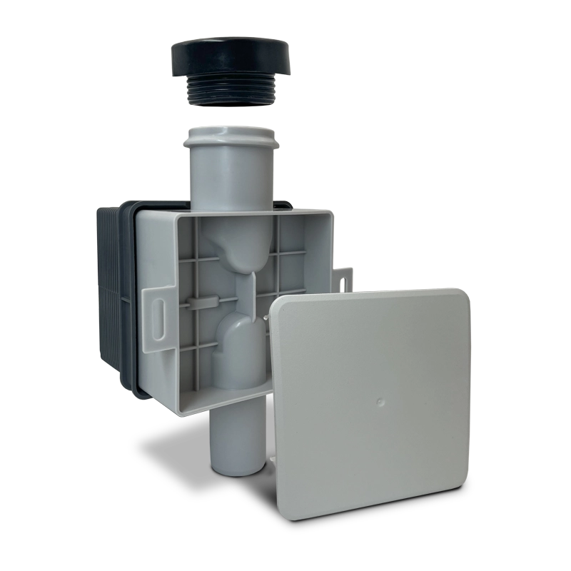 Flush-mounted trap with a ball to prevent unpleasant odours from the sewer. The adjustable mounting cover allows for installation at different wall thickness, and thanks to the rubber reduction, hoses with diameters from 20 to 32 mm can be connected to the trap.