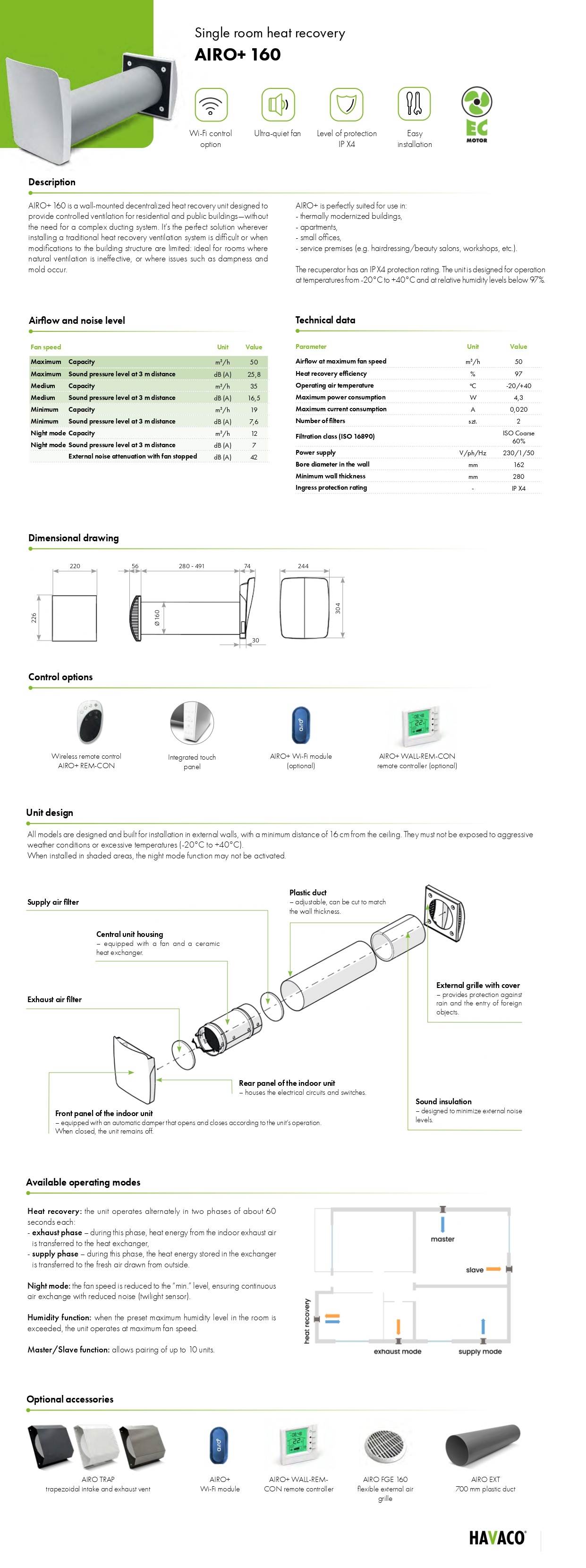 AIRO+ 160 is a wall-mounted decentralized heat recovery unit designed to provide controlled ventilation for residential and public buildings—without the need for a complex ducting system.